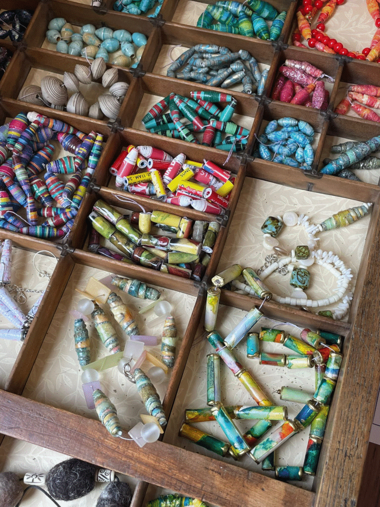 But then we turned to the main event of the day – learning paper and fabric bead making. This was expertly led by Jenny Parker, who brought a large array of samples to demonstrate with.