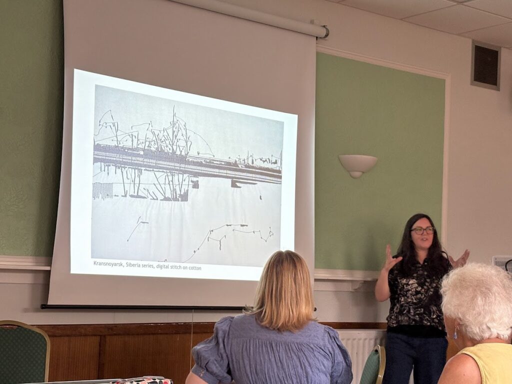 Vanessa explained how she takes references from maps and carries out research exploring countries with her ‘mind’s eye’ that she is unlikely to visit, such as Siberia and Australia. Her work allows her to develop fictional locations as well as develop her techniques. Her grandfather’s old navy kit bag used for holidays, has naturally influenced her colour palette. Whilst navy is a strong feature, Vanessa does not limit herself to just this colour and encouraged us to explore our own colour choices. Part of the appeal of maps and landscapes is that often people can identify with the location. This was illustrated beautifully with a hand stitched depiction of the Norwegian Fjords that was recognisable even without the name to identify it.