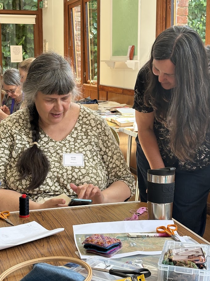 delivered for a group the approaches were individualised. We were encouraged to take a walk around a place we were familiar with…start stitching streets and roads, from memory. If your walk exceeds the width of fabric then join new bits, using fill stitches to identify landmarks; by adding fabric as and when you needed it, it was not as daunting as starting with a large blank piece of fabric. Couching was encouraged, using the same stitch but with different threads, for example a road is a thicker line than a footpath.