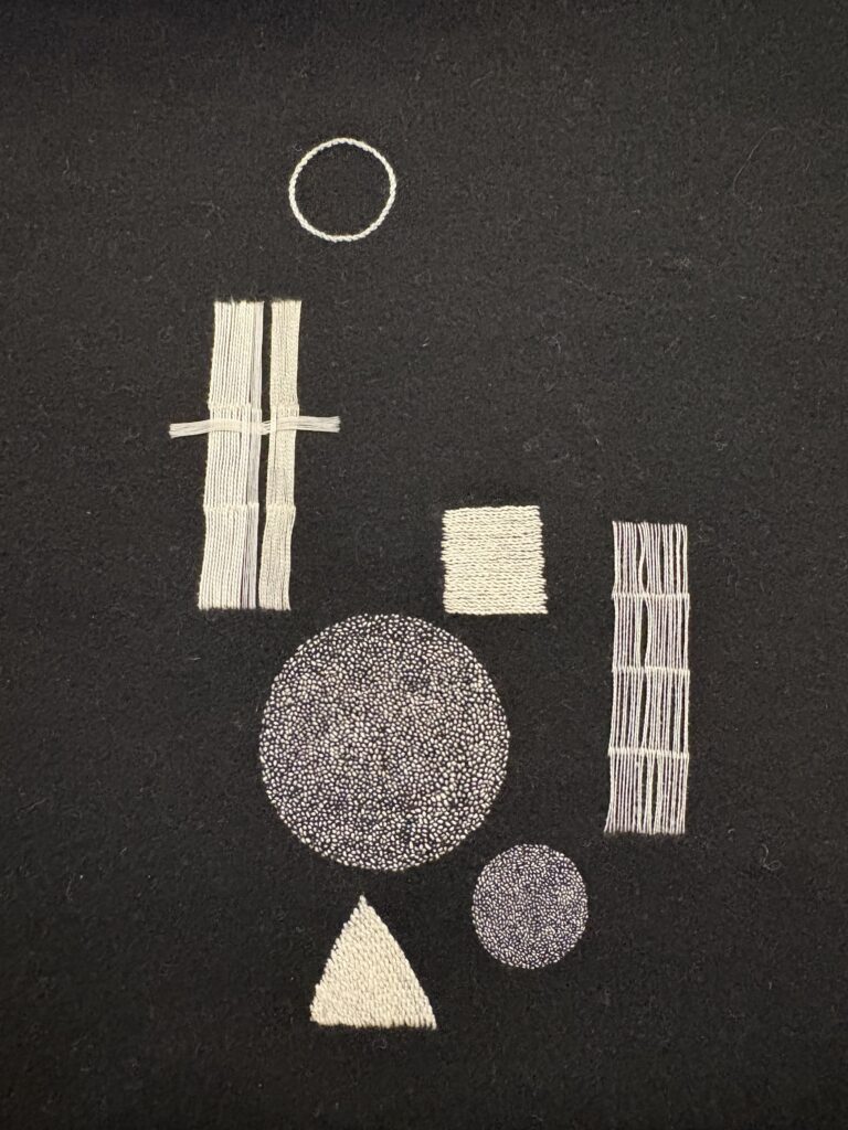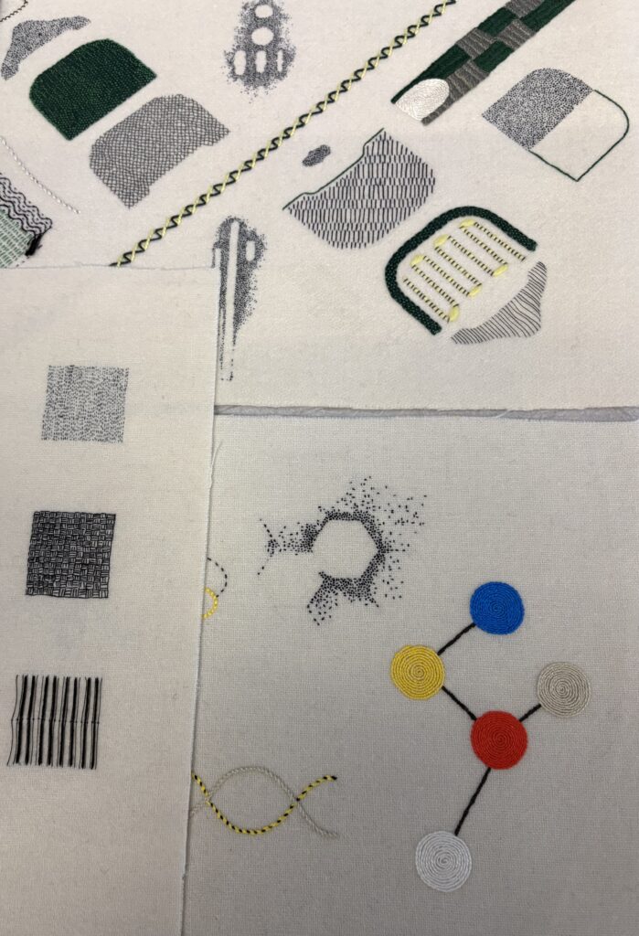 monochrome style is intriguing and it was fascinating to hear about his inspiration and process in an entertaining talk. An artist, designer and painter as well as a stitcher, he describes himself as a ‘geeky nerd’. A lover of science, cosmology and quantum physics, he explores how time ‘looks’ in tangible form. He loves the slow pace of stitching, and the opportunity this affords to think, reflect and analyse. His more recent works has explored links between heritage and materiality, drawing on his father’s working life as a coal miner.